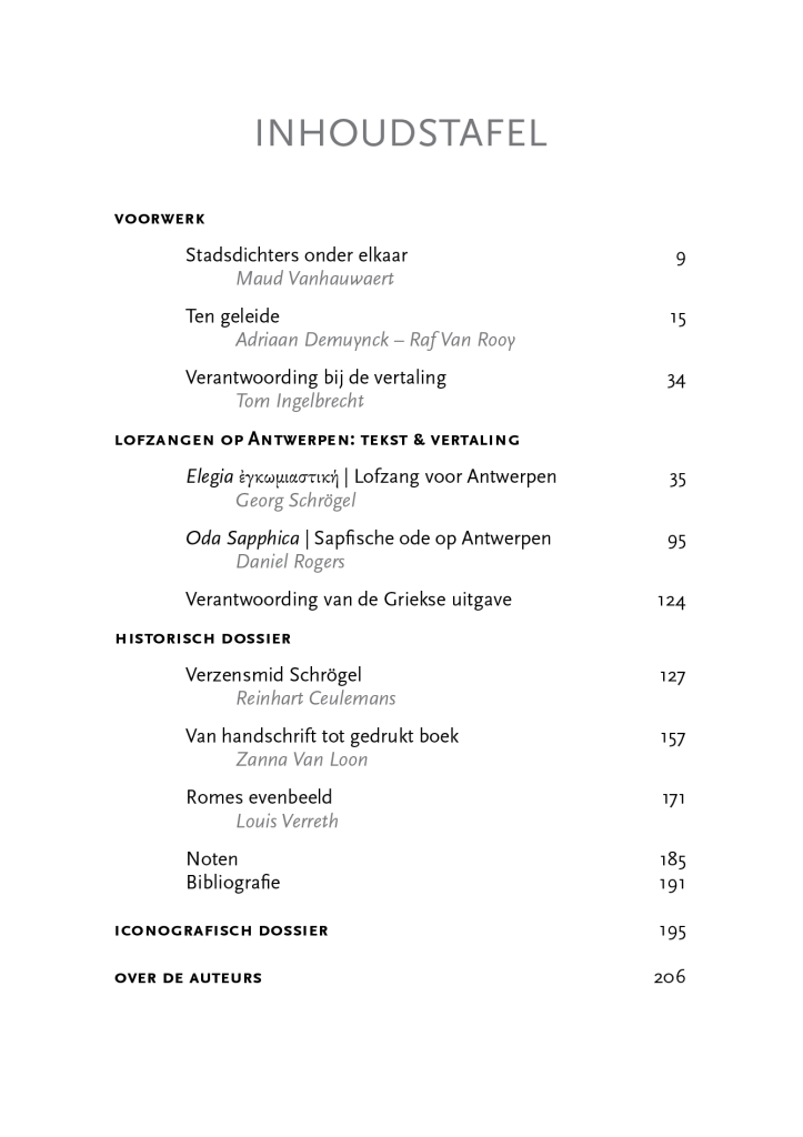 Onze nieuwe uitgave biedt de lezer de Griekse tekst met Nederlandse versvertaling (Tom Ingelbrecht), naast een voorwoord (Maud Vanhauwaert, eertijds Antwerps stadsdichter), inleiding (Adriaan Demuynck en Raf Van Rooy) en een historisch dossier met aandacht voor taaleigen (Reinhart Ceulemans), boekgeschiedenis (Zanna Van Loon) en literaire aspecten (Louis Verreth). Ook de Latijnse parateksten (een lezersbrief en begeleidende gedichten) worden in het origineel en in Nederlandse vertaling aangeboden. Hieronder de inhoudstafel van het boek.
